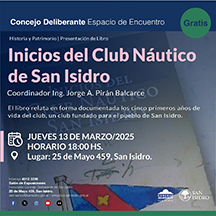 La presentación, a cargo de coordinador Jorge Pirán Balcarse, se realizará el jueves 13 de marzo, a las 18, en el Concejo Deliberante de San Isidro (25 de Mayo 459). Entrada libre y gratuita.
