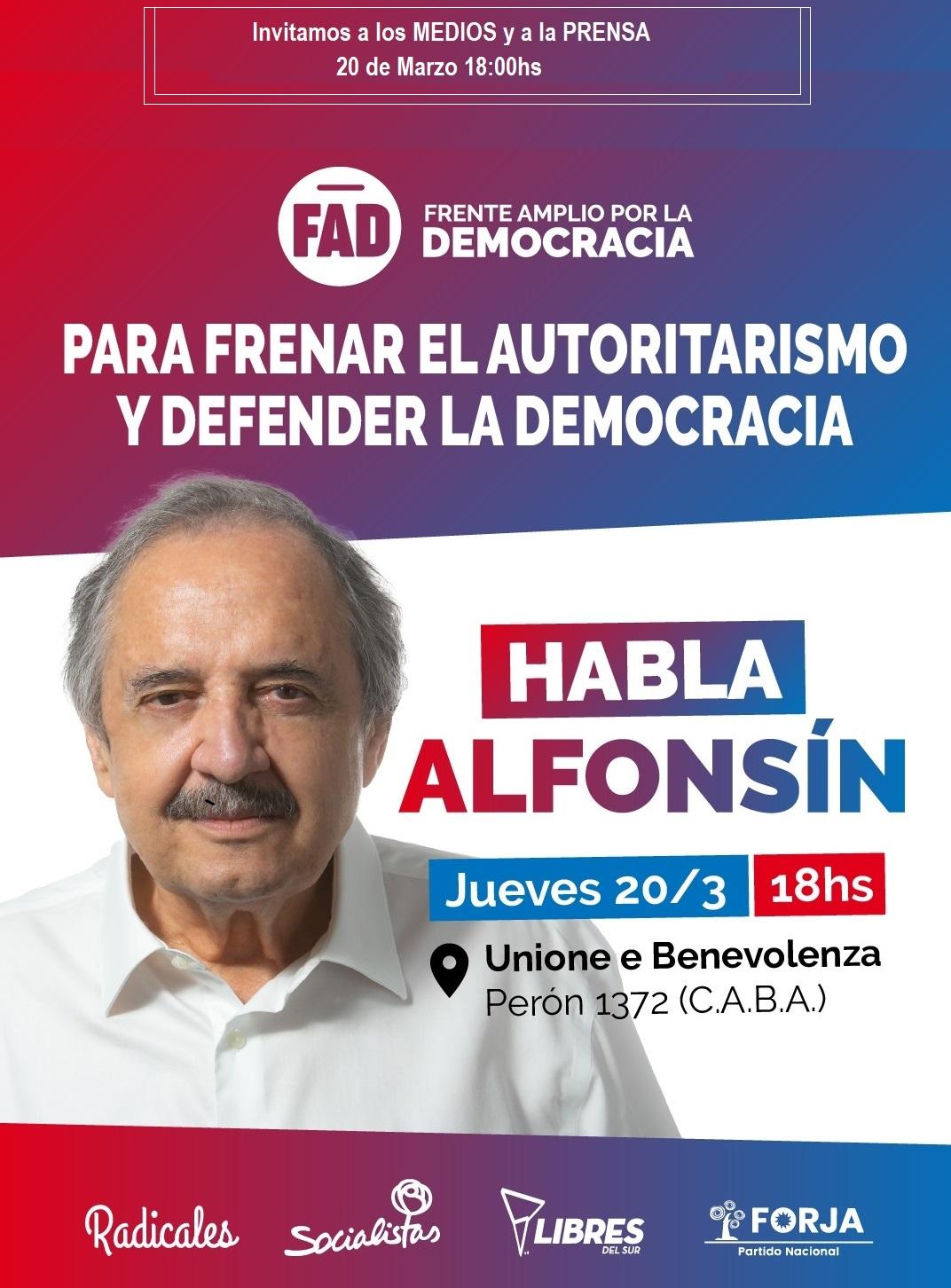 El acto contará con las palabras de Alfonsín, Silvia Saravia (Libres del Sur), Gustavo López (Forja) y Martín Canay (Socialistas) quienes vienen señalando los peligros para la democracia que entraña el actual oficialismo nacional y se posicionan como un frente superador del actual escenario de agresividad y polarización.