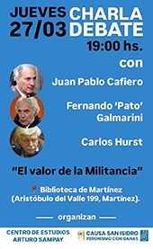 El próximo jueves 27, a las 19, la Biblioteca Popular de Martínez, A. del Valle 199, será fiel testigo de una charla abierta que lleva como título “El valor de la militancia”. Juan Pablo “Juampi” Cafiero, Fernando “Pato” Galmarini y Carlos Hurst, con un largo y rico recorrido quienes han hecho de la militancia una entrega plena, un acto de vida, serán los encargados de brindar la charla.