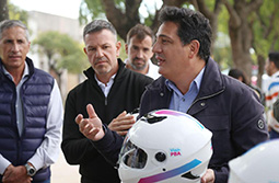 El titular de Transporte bonaerense y el intendente local encabezaron una jornada de concientización vial con entrega de cascos, capacitaciones a motociclistas y una fuerte apuesta por la movilidad sustentable.