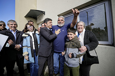 El gobernador de la provincia de Buenos Aires, Axel Kicillof, encabezó este miércoles el acto de entrega de 36 viviendas y de escrituras gratuitas en beneficio de familias del municipio de Chivilcoy. Fue junto a la ministra de Hábitat y Desarrollo Urbano, Silvina Batakis; su par de Justicia y Derechos Humanos, Juan Martín Mena; y el intendente local, Guillermo Britos.