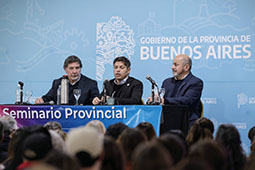 Kicillof expresó: “Este seminario está inscripto dentro de las políticas de un Estado provincial que recuperó sus capacidades de planificación y que comprende, además, que la única manera de transformar la educación pública es con la participación de quienes la construyen día a día”. “Sabemos que hay deserción y dificultades que se agravan por la situación social, pero no nos quedemos quietos: impulsamos políticas innovadoras que, con inversión y un gran compromiso de toda la comunidad, nos permiten revincular a los jóvenes con la escuela para brindarles mejores oportunidades y un futuro mejor”, agregó.