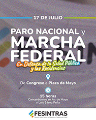 La Federación Sindical Nacional de Trabajadores y Trabajadoras de la Salud (FESINTRAS) anunció para este jueves 17 de julio un Paro Nacional de Salud con movilización desde el Congreso de la Nación hacia Plaza de Mayo. La medida es de carácter federal y es “en rechazo al enorme daño que están ocasionando las políticas de ajuste del Gobierno Nacional a las residencias públicas y al sistema de salud en su conjunto”.