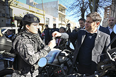 Durante la jornada, Kicillof y el ministro de Seguridad, Javier Alonso, pusieron en funcionamiento 15 nuevas motos para fortalecer la prevención del delito en el distrito, donde además se incorporaron 26 agentes.