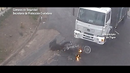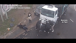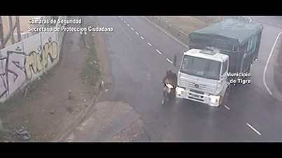 Las cámaras del Centro de Operaciones Tigre (COT) registraron un siniestro vial entre un camión y una moto en la localidad de El Talar. Luego del choque – que ocurrió en horas de la mañana – se activó el operativo correspondiente para asistir a la víctima que se encuentra fuera de peligro.