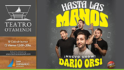 Viernes 12 – 20 hs. Viernes de Humor: “Hasta las Manos”. Unipersonal de Darío Orsi. En el amor, en el trabajo, con la familia, con los amigos, en la calle… ¿Quién no estuvo hasta las manos alguna vez? El unipersonal de Darío Orsi es un paseo por anécdotas desafortunadas, vivencias y reflexiones absurdas que componen el universo de “Hasta las manos”. Con sus shows anteriores recorrió todas las ciudades de Argentina y se presentó en Paraguay, Chile, Uruguay, Países Bajos, Irlanda, Portugal, Inglaterra y España. Además, sus divertidas improvisaciones en Instagram y TikTok acumulan millones de visualizaciones.