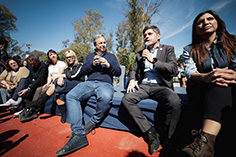 Durante su visita a la UNaB, Kicillof recorrió los terrenos donde la provincia retomará la construcción de un edificio de dos niveles y la restauración de la sede del rectorado, obras que fueron paralizadas por el Gobierno Nacional. Allí, en el parque de la ex Quinta Rocca, que está siendo puesto en valor por el municipio, el Gobernador conversó con estudiantes de nivel secundario y universitario.