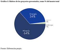 Portafolio total: 20 presentaciones por USD 34.422 M. Composición sectorial: 65% minería y 33% energía. El resto se reparte entre proyectos de siderurgia e infraestructura).