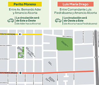– Luis María Drago: Ahora de sentido único de Oeste a Este en un tramo de ocho cuadras, desde Amancio Alcorta hasta Cmte. Luis Piedrabuena. Anteriormente, esta calle de 7 metros de ancho sufría alta congestión debido al estacionamiento en ambos lados. El cambio elimina una fase semafórica en la intersección con Av. Bernardo Ader, optimizando los tiempos de los semáforos y mejorando la fluidez en ambos sentidos.