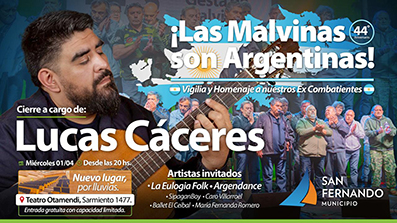 En vísperas del Día del Veterano de Guerra y Caídos en Malvinas, que recuerda y homenajea a nuestros Héroes contemporáneos, el Municipio de San Fernando organizó el miércoles 1 de abril a partir de las 20 horas en el Teatro Otamendi (Sarmiento 1477, nueva ubicación por pronóstico de lluvias) una Vigilia y show musical de artistas locales, con cierre a cargo del popular folklorista Lucas Cáceres.