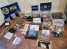 Además, se secuestraron varias dosis de hongos alucinógenos y de marihuana listos para su venta, pastillas de éxtasis de distintos colores “Miami vice”, golosinas con THC, 1 pistola calibre 9 mm y 29 cartuchos de bala del mismo calibre, dinero en efectivo, 1 notebook, 3 teléfonos celulares y documentación de interés para la causa.