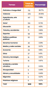 Pero el dato más significativo no es solo la baja presencia, sino el modo en que la infancia aparece representada. Entre las noticias relevadas, los temas predominantes son los policiales y de inseguridad (38,77%) y las distintas formas de violencia (20,55%). En otras palabras, cuando niñas, niños y adolescentes logran visibilidad en los noticieros, lo hacen mayormente asociados a hechos delictivos, situaciones de riesgo o conflictos.